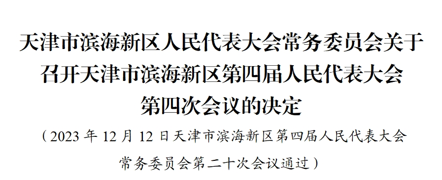 |  天津市滨海新区第四届人民代表大会常务委员会第二十次会议决定:天津市滨海新区第四届人民代表大会第四次会议于2024年1月10日召开。建议会议的议程是:听取和审议滨海新区人民政府工作报告;审查和批准滨海新区2023年国民经济和社会发展计划执行情况与2024年国民经济和社会发展计划草案的报告,批准2024年国民经济和社会发展计划;审查和批准滨海新区2023年预算执行情况和2024年预算草案的报告,批准2024年区级预算;听取和审议滨海新区人民代表大会常务委员会工作报告;听取和审议滨海新区人民法院工作报告;听取和审议滨海新区人民检察院工作报告;审议滨海新区2023年20项民心工程项目完成情况和2024年20项民心工程候选项目征集情况的报告,票决滨海新区2024年20项民心工程项目;选举和表决事项。 |